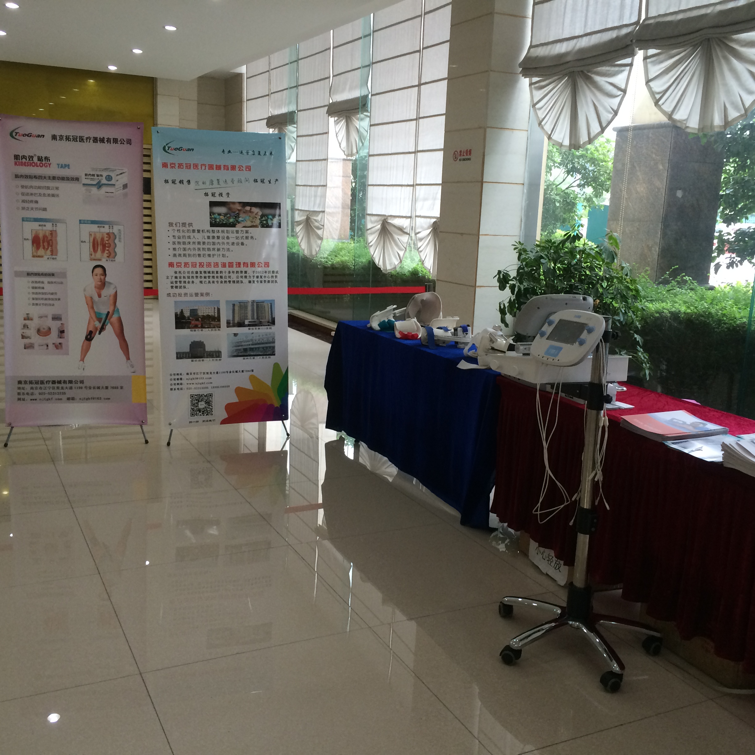拓冠攜自主產品滑軌式懸吊系統(TG-NPT-X1),美國JAS、法國Kinetec關節鍛煉運動器、荷蘭En-raf的電療工作站(Sonopuls632VX)、超聲治療儀(Sonopuls190)、神經肌肉刺激器